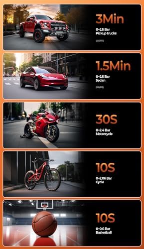 【4+N Smart Modes】4 preset inflation modes (bike, motorcycle, car, and ball) are convenient for beginners to choose from. The manual mode can also set the pressure value (3-150psi) according to the inflation object to meet various inflation requirements. It is an ideal choice for inflating trucks, cars, motorcycles, and bicycle tires.