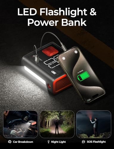 【Multiple Practical Functions】More than just a tire pump. There is also a USB-C input port/a USB-A output port, making it an emergency power source for mobile phones or other digital devices. At the same time, the top is equipped with an LED emergency light, which helps to provide convenience for inflating and changing tires in dark places.