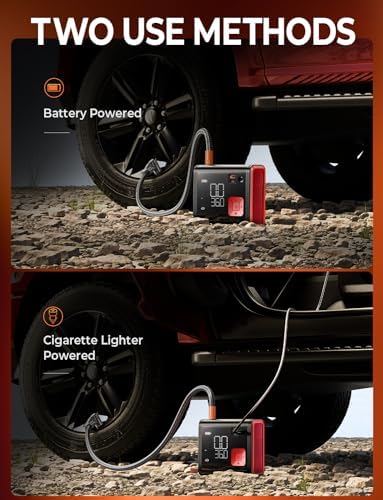 【Accurate LED Dual Screen】Air pump for car tires is equipped with dual digital LED screens, the upper and lower screens display real-time tire pressure and preset tire pressure data. The tire pump can preset and monitor the tire pressure, and automatically shut off when the set pressure is reached. No need to worry about over-inflating your tires.