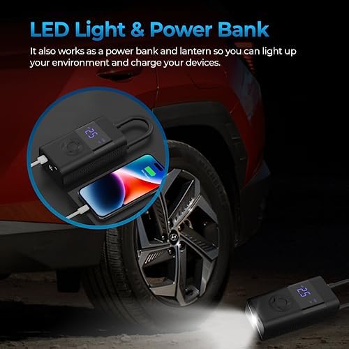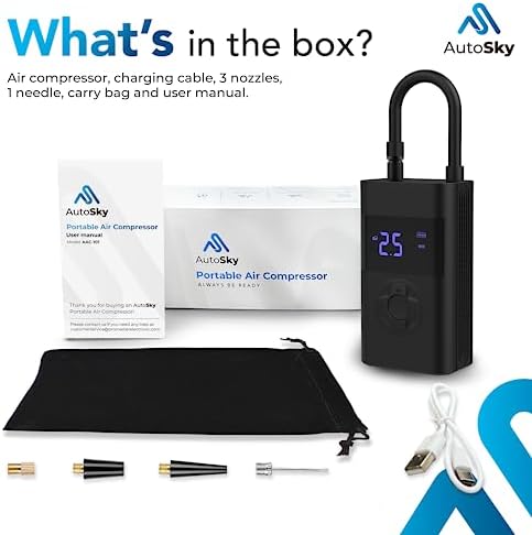 Air Pump with Tire Pressure Gauge : The AutoSky Portable air Compressor features a built-in digital tire pressure gauge that allows you to monitor the pressure level adjust it as needed.